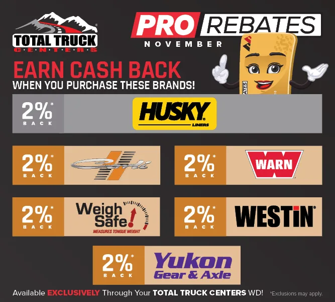 Buy products from the following brands from your Total Truck Centers distributor in November and get cash back based on the percentages shown. Rewards are paid via prepaid Visa debit card. That’s no-strings cash back just for buying the brands and products you normally would!